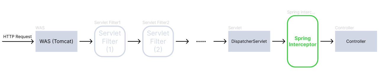 Servlet Filter는 서블릿이 호출되기 전에 수문장 역할을 수행했지만, "Spring Interceptor"는 DispatcherServlet과 Controller사이에서 컨트롤러가 호출되기 직전에 호출된다