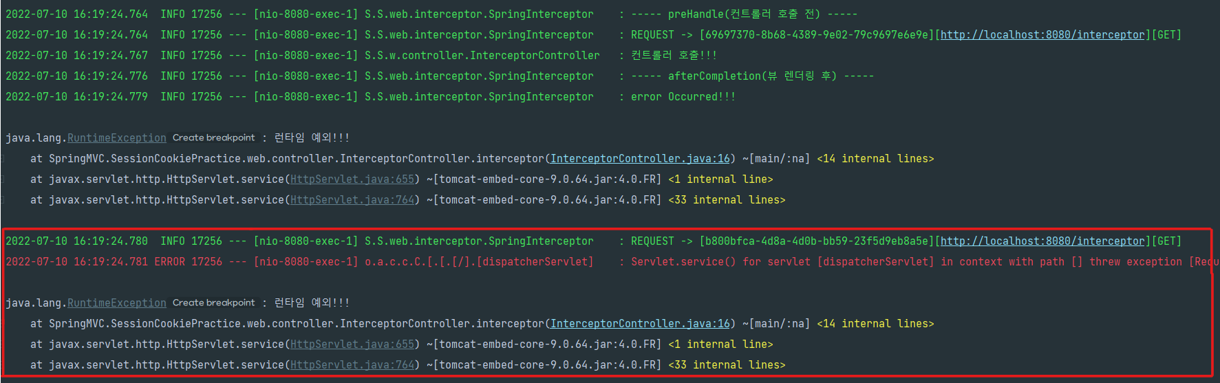 그리고 동일하게 인터셉터가 "이 Request는 적절하지 않은 요청같습니다"라고 판단하면 거기서 중단하고 결국 컨트롤러는 호출되지 않는다