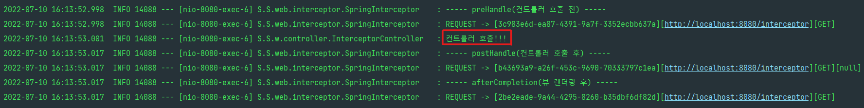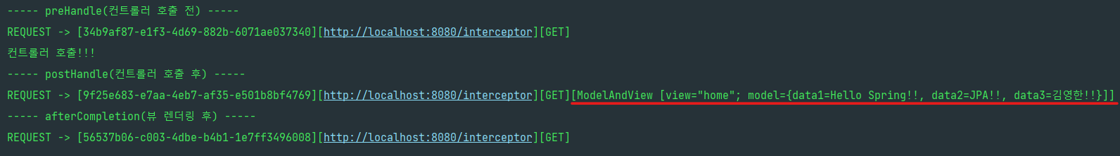 결과를 보면 컨트롤러 호출 전에 "preHandle"이 호출되고, 컨트롤러 호출 후에 "postHandle"이 호출된다