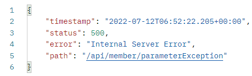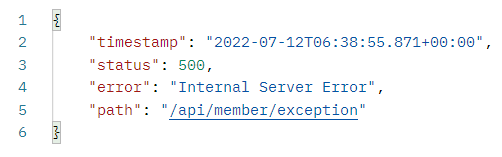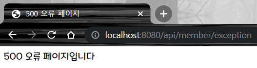 그러면 이제 "/api/member/exception"으로 request를 보내고 의도적으로 오류를 발생시켜보자