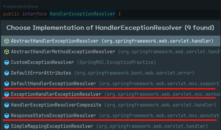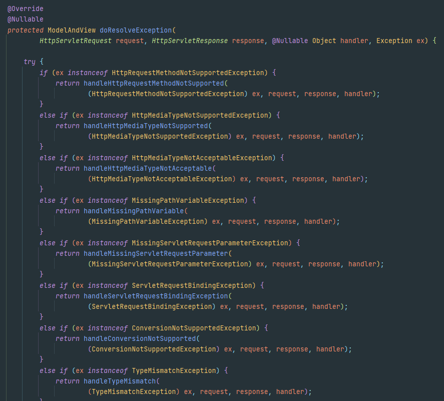 이렇게 스프링 내부에서 발생하는 스프링 예외에 대한 수많은 처리가 명시되어 있다