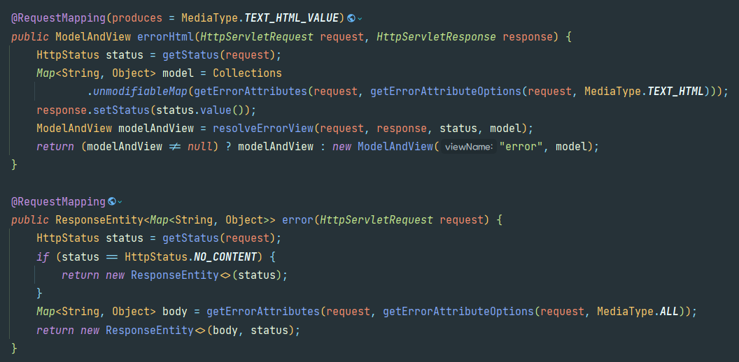 이전에 스프링 부트의 예외 처리를 위한 ErrorMvcAutoConfiguration클래스는 위와 같은 2가지 메소드를 가지고 있다고 하였다