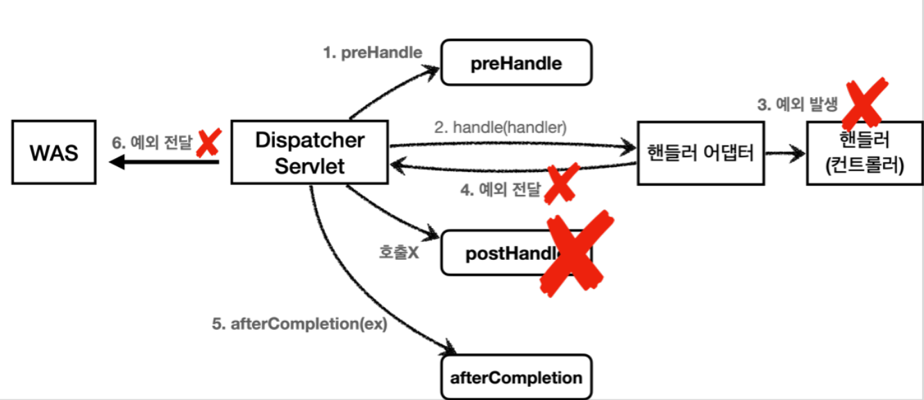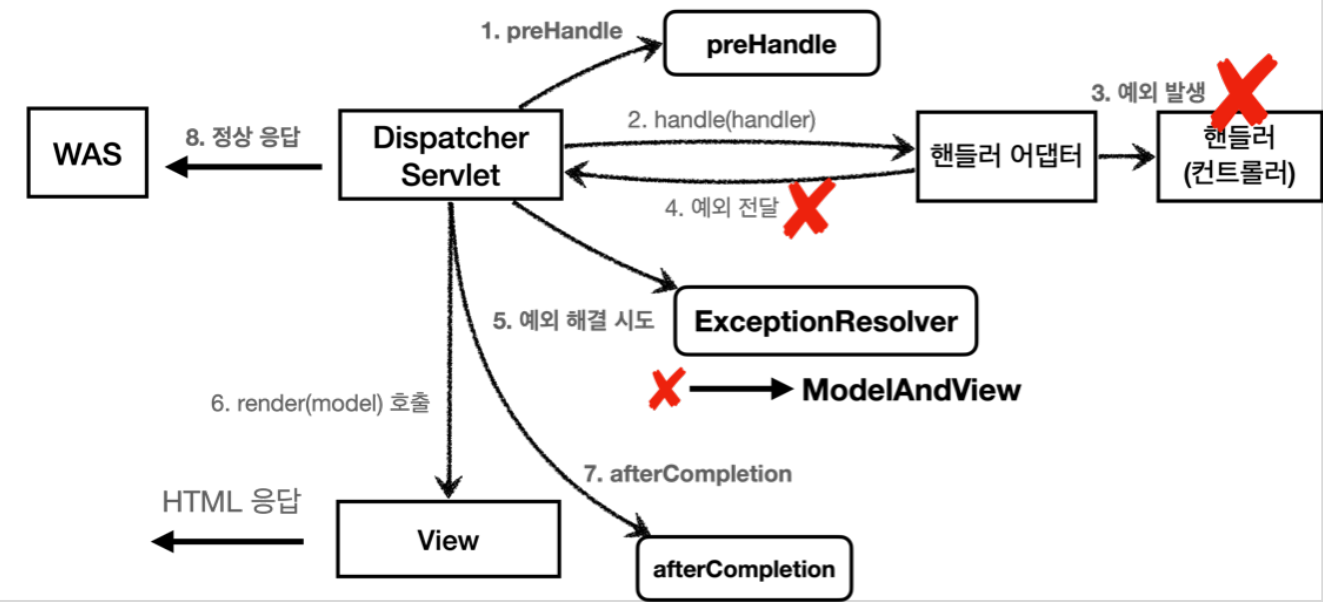 하지만 "ExceptionResolver"를 활용하면 예외가 발생했을 때 흐름이 역으로 오는동안 처리할 수 있기 때문에 여기서 끝낼 수 있다