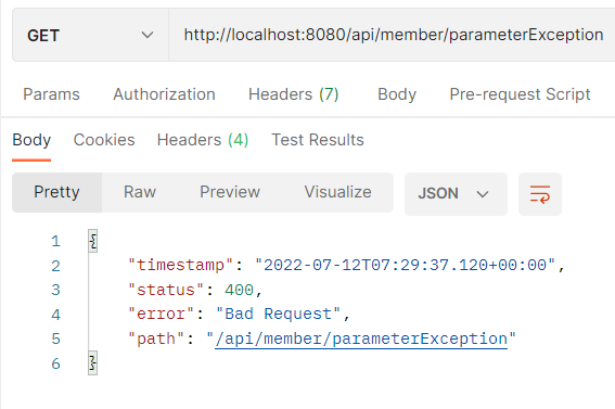 이제 IllegalArgument에 대해서는 400으로 Response하는 것을 확인하였다