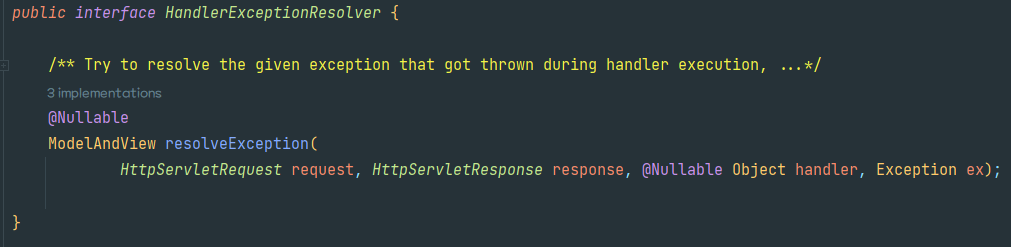 HandlerExceptionResolver 인터페이스는 내부에 resolveException이라는 메소드 하나를 가지고 있고 이 메소드는 "ModelAndView"를 return한다
