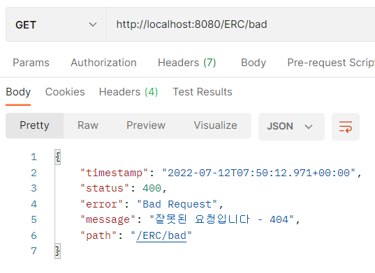 이제 원하는 형식대로 JSON Error Response가 도착한 것을 확인할 수 있다
