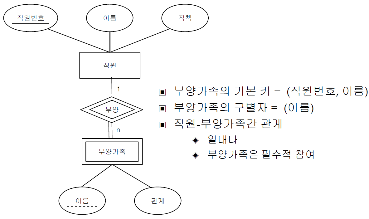 - 1개의 약한 개체는 1개의 식별 개체와 관계를 맺음 (약한 개체는 필수적 참여)