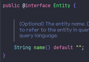 엔티티 이름은 @Entity내부의 name에 설정해주면 되고 엔티티 이름을 따로 지정해주지 않으면 클래스 이름과 동일하게 사용하면 된다