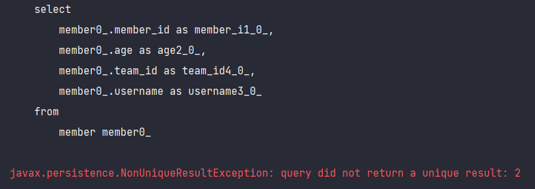 그러면 위에서 getResultList()로 받았던 2건의 Member데이터를 getSingleResult로 받으면 진짜 예외가 터지는지 한번 살펴보자