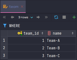 여기서 Team 이름에 대한 내림차순 정렬 후 2건의 페이징 처리한 결과를 도출해보자