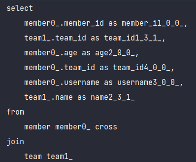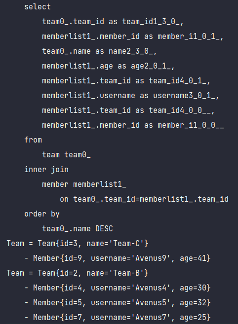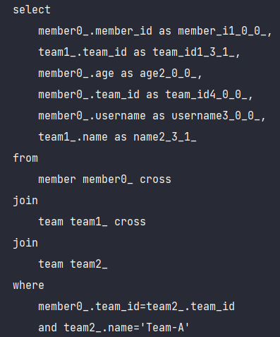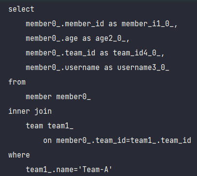 이처럼 Team에 대한 엔티티를 직접 매핑하게 된다면 query의 조인 조건인 on절이 제대로 표시되지 않음을 확인할 수 있다