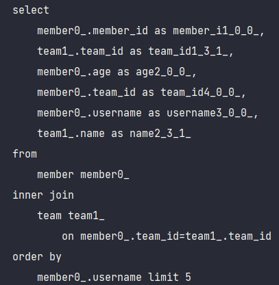 현재 페치 조인 대상인 m.team에 대해서 별칭 t를 주고 where절에서 별칭을 사용해서 조건을 지정하고 있다.