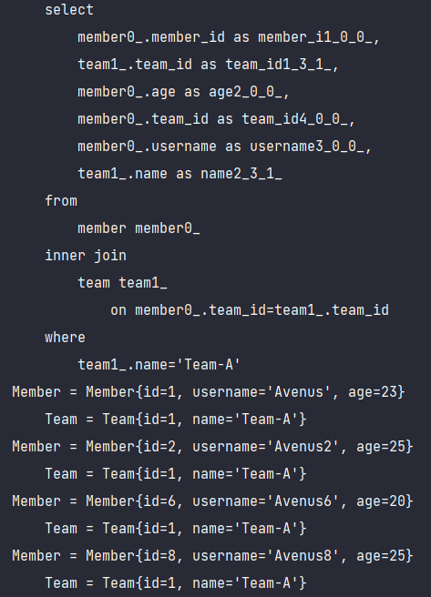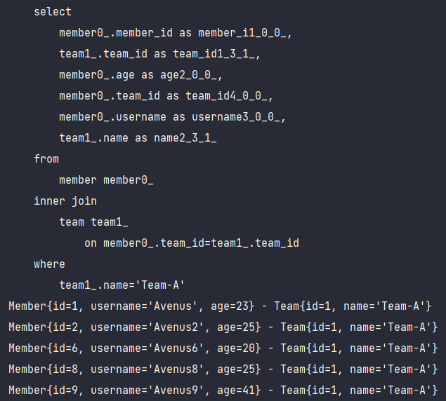 "SELECT m, t FROM Member m, Team t WHERE m.team.name = 'Team-A'"