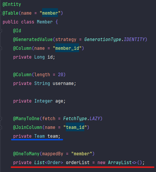 테스트를 위해서 Member Entity상에 "다대일 관계인 Team / 일대다 관계인 orderList"를 연관관계를 맺어두었다