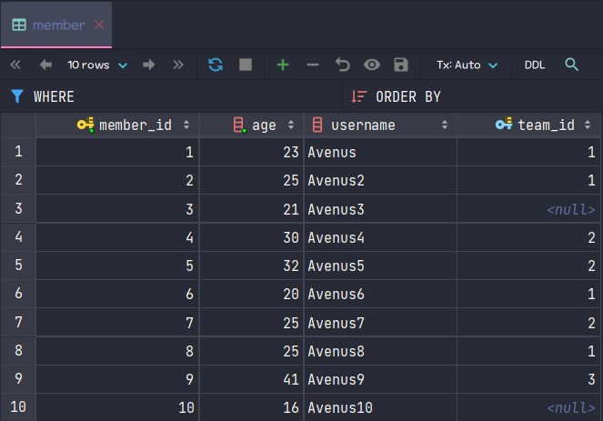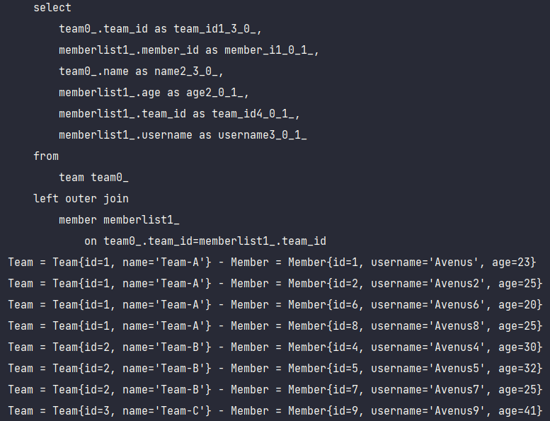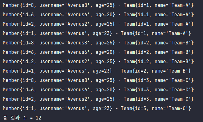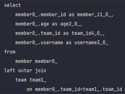 LEFT OUTER JOIN이므로 Member 데이터는 전부 당겨오고 Member에 대한 Team 조각들을 맞춰서 결과가 도출되었다