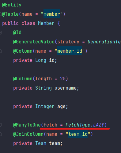 현재 Member Entity상에서의 연관 엔티티인 Team은 FetchType이 LAZY = 지연로딩으로 설정되어 있다