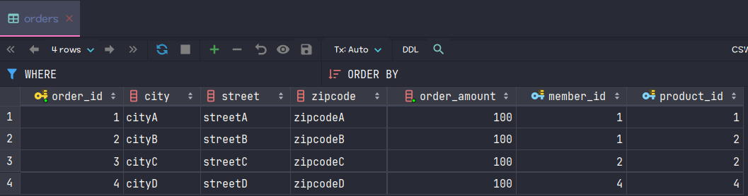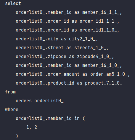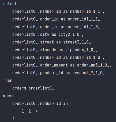 그리고 오른쪽 쿼리는 "지연로딩 최적화를 위해 설정한 batch_fetch_size"만큼의 OrderList가 IN쿼리로 당겨와진것을 확인할 수 있다