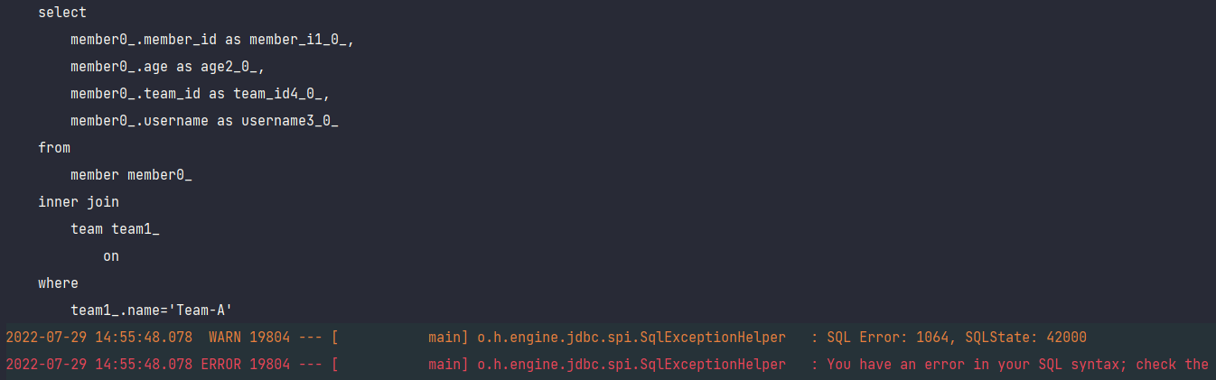 위의 JPQL 조인을 SQL 조인 형태로 바꿔도 과연 제대로 쿼리가 나가는지 확인해보자