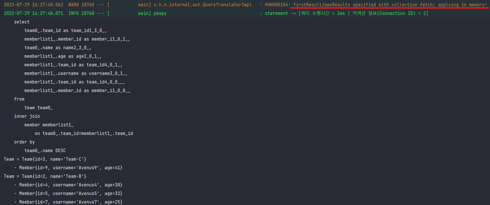 일단 Member를 조회할 때 Team을 fetch join하지말고 그냥 join을 써서 쿼리를 날려보자