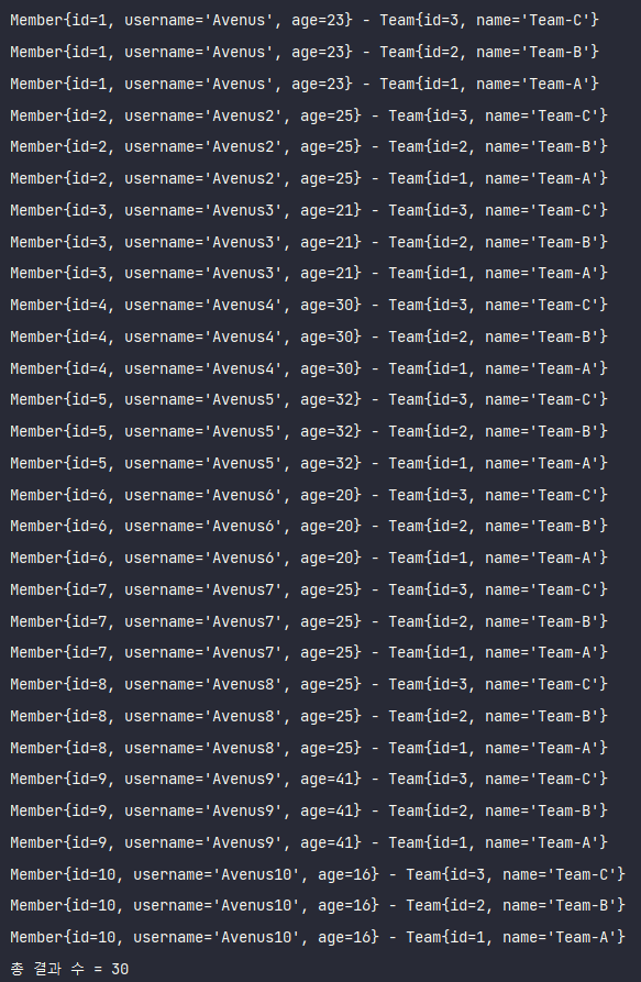 Member와 Team간의 Cross Join의 결과 Instance 수는 10 X 3 = 30건이 도출될 것이다