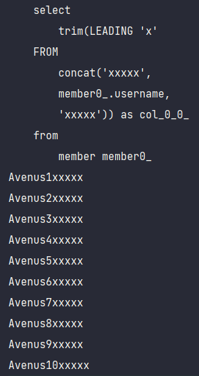 "SELECT TRIM(LEADING 'x' FROM CONCAT('xxxxx', m.username, 'xxxxx'))" +