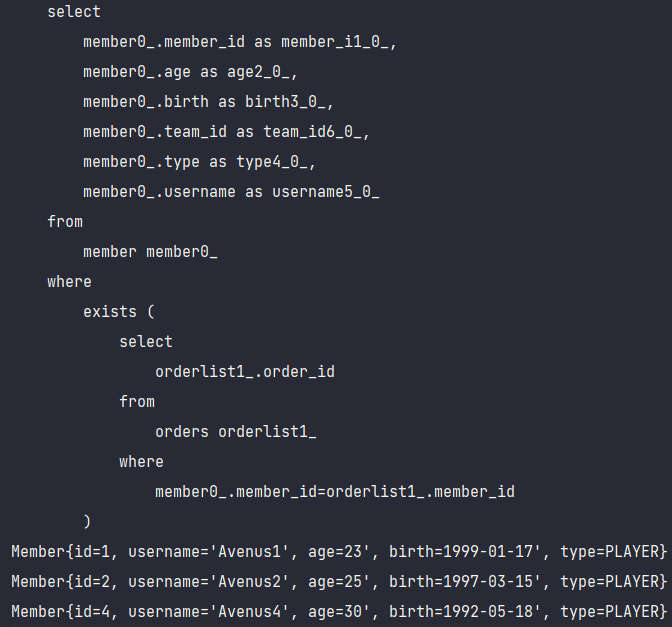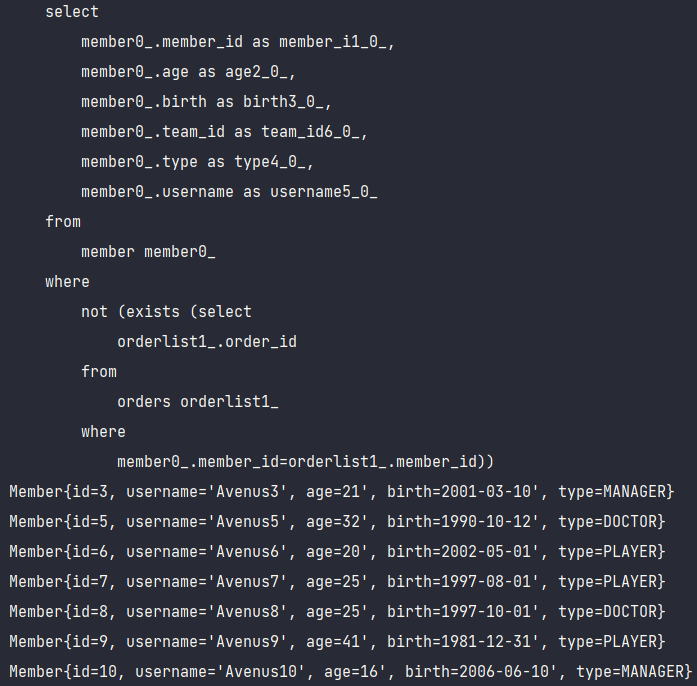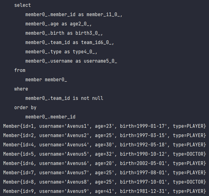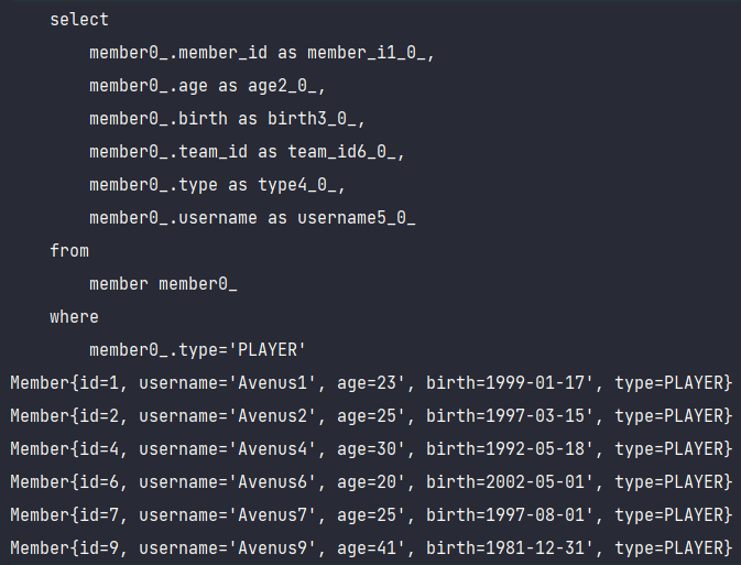 " WHERE m.type = JPA.QueryPractice.domain.MemberType.PLAYER",