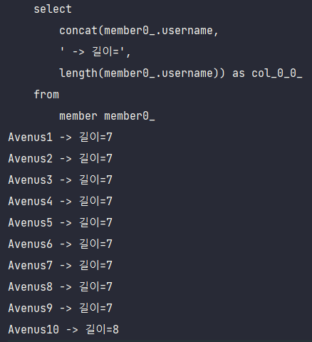 "SELECT CONCAT(m.username, ' -> 길이=', LENGTH(m.username))" +