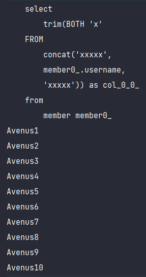 "SELECT TRIM(TRAILING 'x' FROM CONCAT('xxxxx', m.username, 'xxxxx'))" +