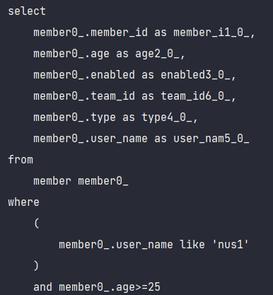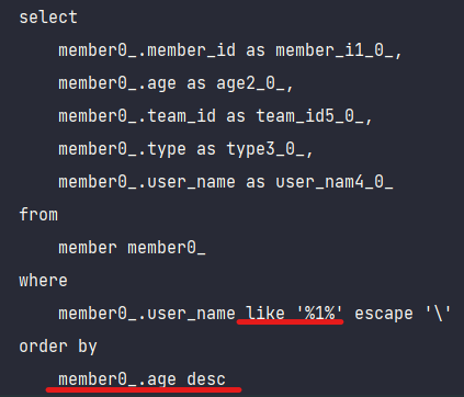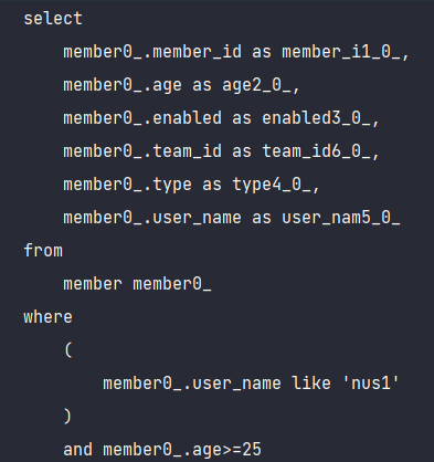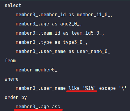 @Query("SELECT m FROM Member m WHERE m.username LIKE ?1 AND m.age >= ?2")