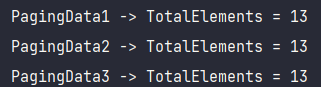 실질적으로 Page[0, 1, 2]에 담긴 데이터의 개수는 [10, 3, 0]개 이지만, getTotalElements()는 각 페이지별이 아닌 전체 페이지의 전체 데이터 개수이므로 동일하게 "13"이 return됨을 확인할 수 있다