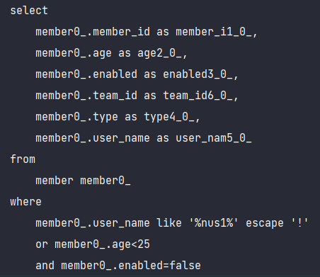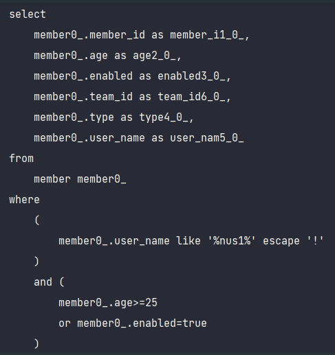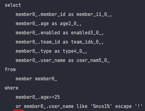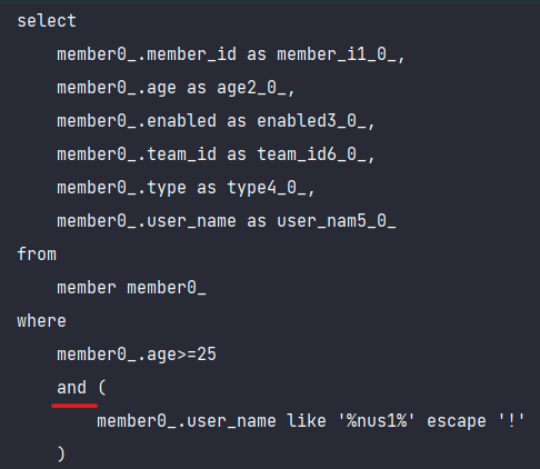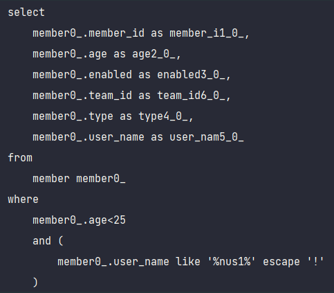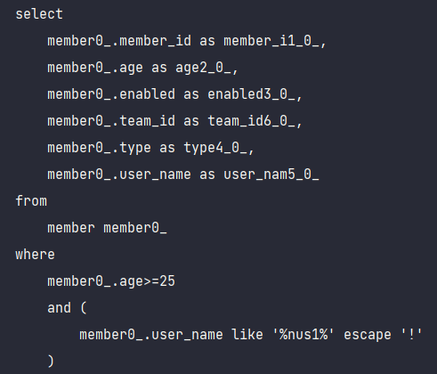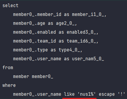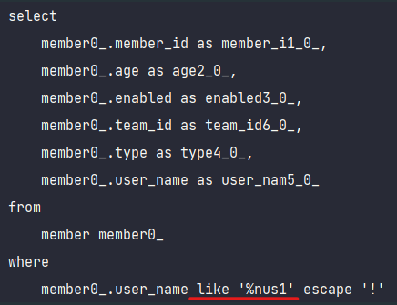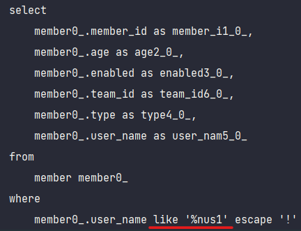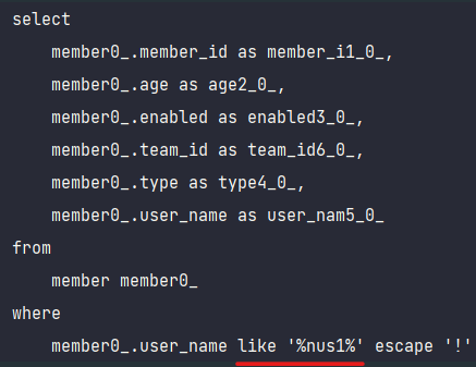.where(member.username.contains("nus1")) // username LIKE '%nus1%'