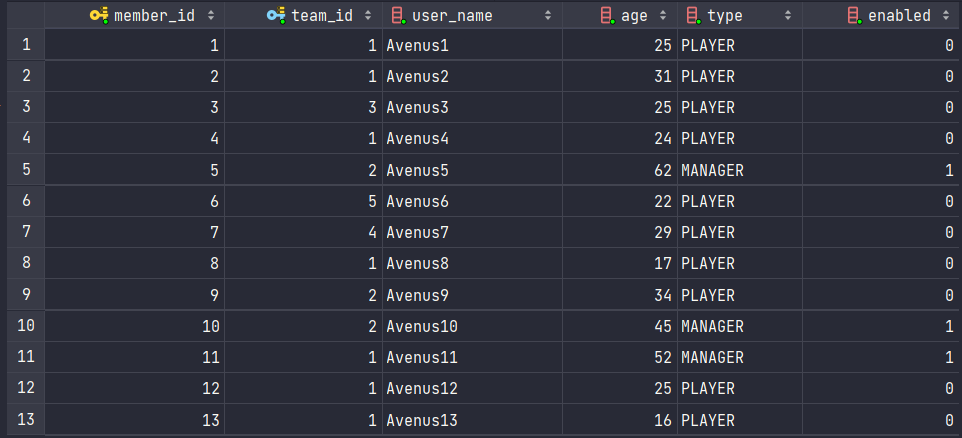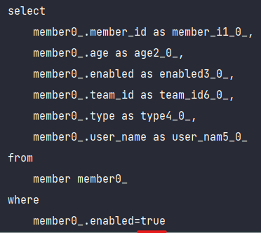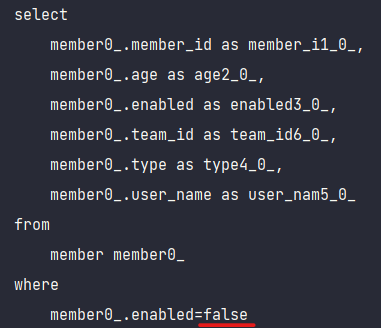 결과로 알 수 있듯이 Member Table상에서 enabled의 값에는 전부 true/false로 들어가있지만 query상에서 enabled를 조회하지 않았기 때문에 전부 null로 들어가게 된다