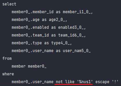 .where(member.username.notLike("%nus1")) // username NOT LIKE '%nus1%'