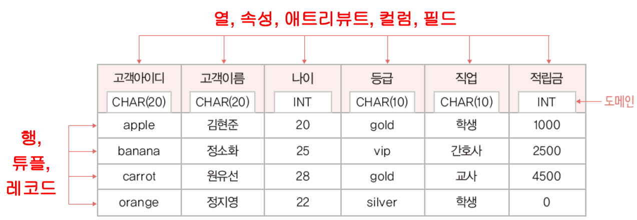 - 릴레이션(Relation) : 행과 열로 구성된 테이블