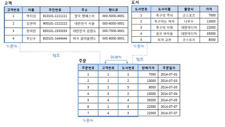 주문(주문번호, 고객번호(FK), 도서번호(FK), 판매 가격, 주문 일자)