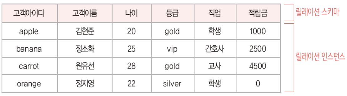 - 릴레이션 이름과 속성 이름으로 정의 ex) 고객(고객 아이디, 고객 이름, 나이, 등급, 직업, 적립금)