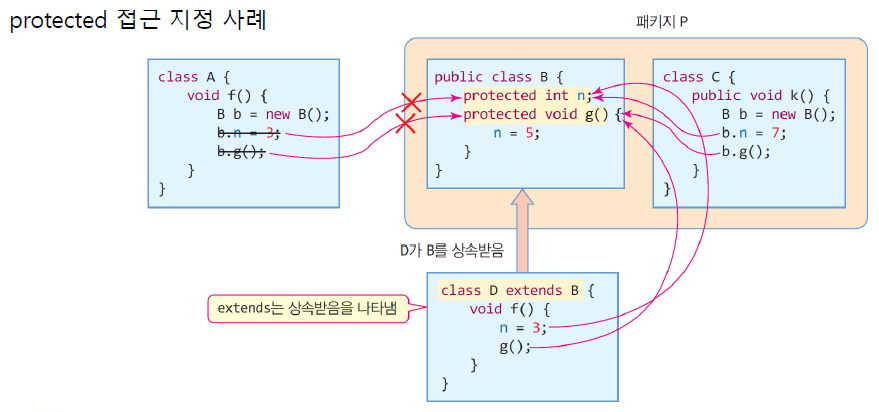 | 접근 가능 영역 | 클래스 내 | 동일 패키지 내 | 동일 패키지 + (다른 패키지에 있는데) 자식 클래스 |