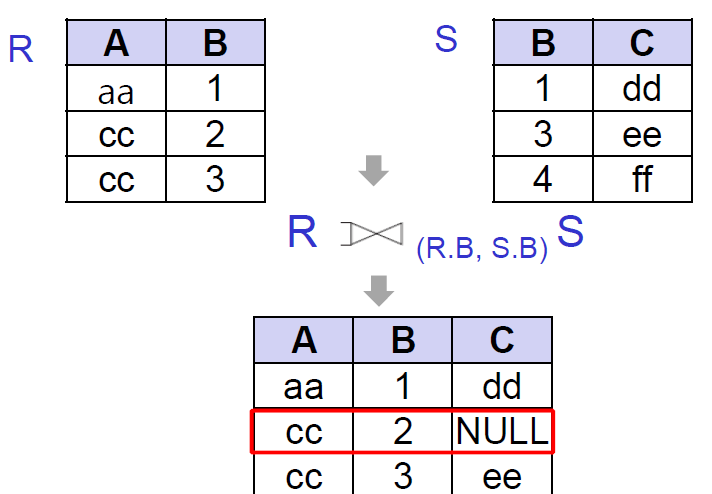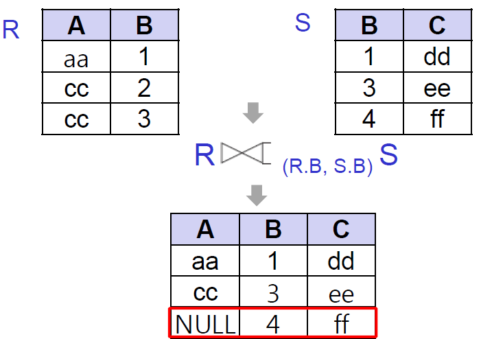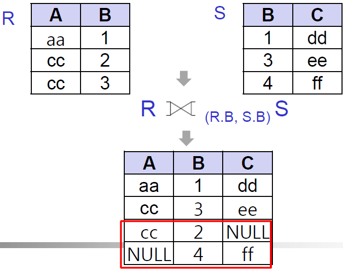 - 양쪽 릴레이션의 모든 투플들을 결과에 포함시키고, 만일 상대 릴레이션에 관련된 투플이 없으면 NULL값으로 채운다