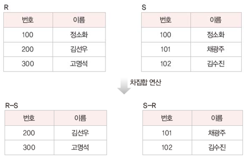 - 릴레이션이 투플들의 집합이기 때문에 기존의 집합 연산이 릴레이션에 적용됨