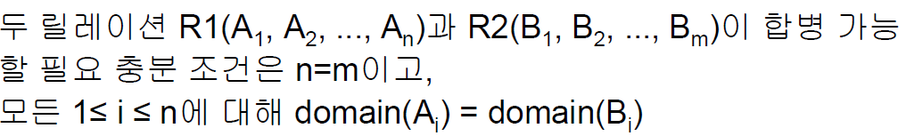 - 집합 연산자의 입력으로 사용되는 2개의 릴레이션은 합병 가능 조건을 만족해야 한다