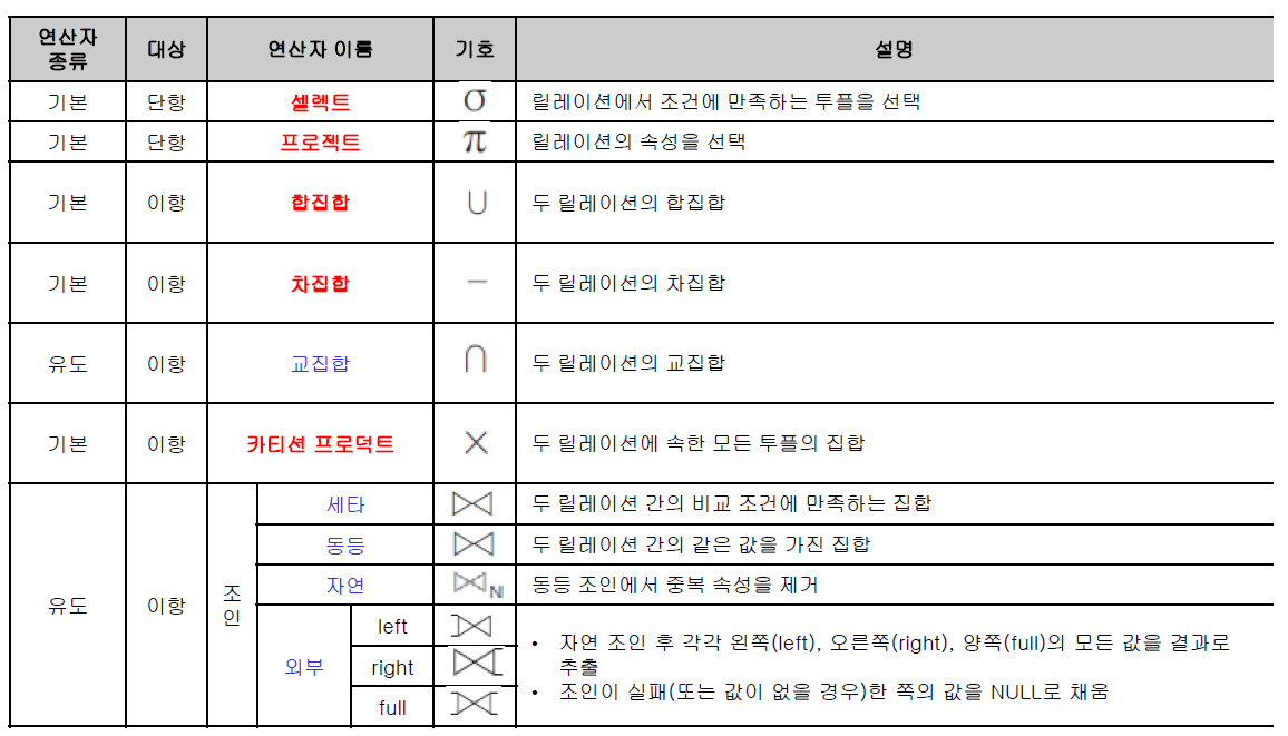- 기본 연산 : 세타 조인(Theta), 동등 조인(Equi), 자연 조인(Natural)
