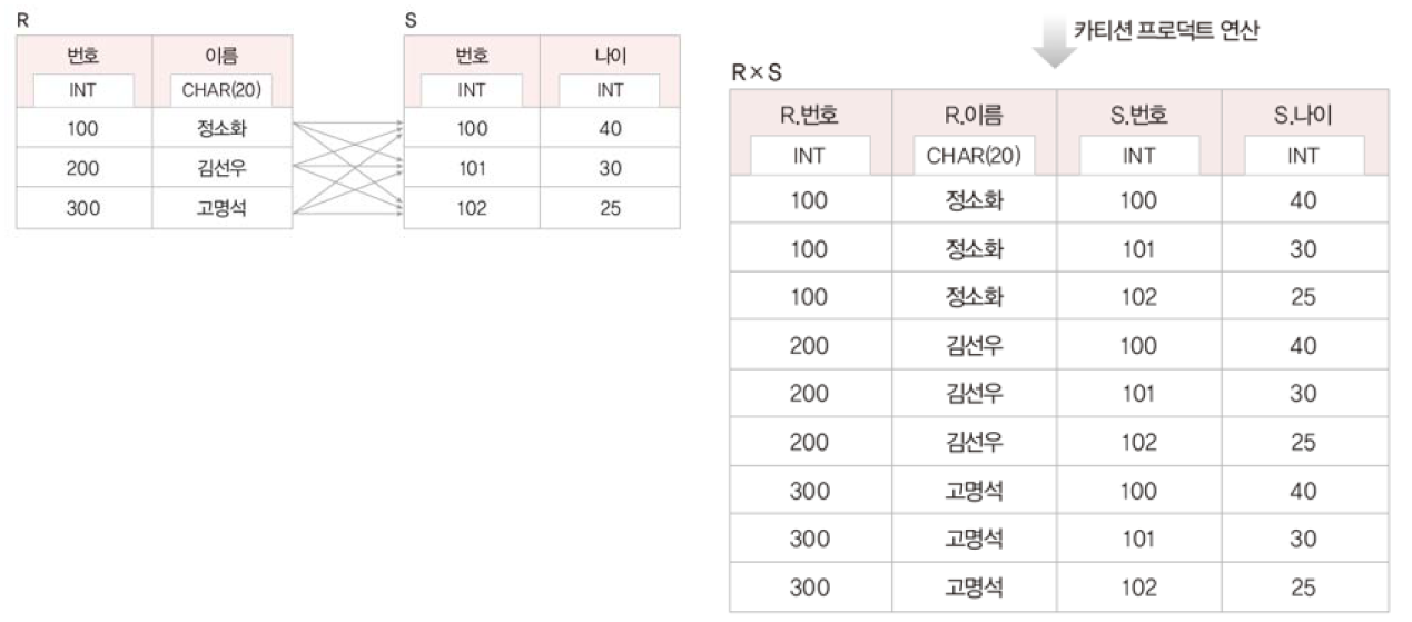- R과 S의 투플들의 모든 가능한 조합을 이루어진 릴레이션